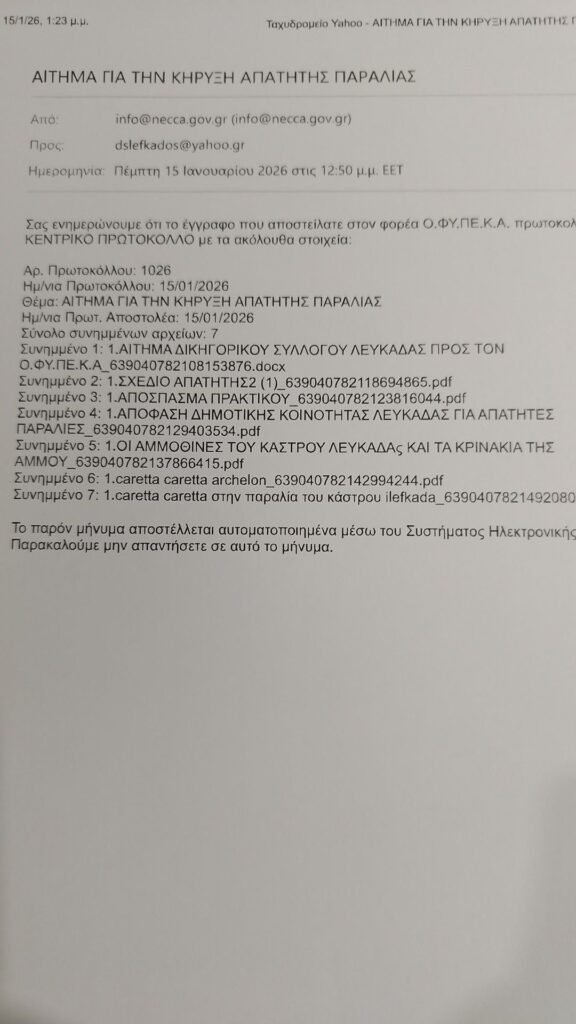 Ο ΔΙΚΗΓΟΡΙΚΟΣ ΣΥΛΛΟΓΟΣ ΛΕΥΚΑΔΑΣ απέστειλε σήμερα ΑΙΤΗΜΑ στον ΟΦΥΠΕΚΑ προκειμένου να εισηγηθεί σύμφωνα με το νόμο την κήρυξη της παραλίας έμπροσθεν του Τουριστικού Περιπτέρου και του Οινοποιείου ΤΑΟΛ ως απάτητης .