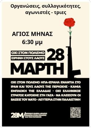 Το Σάββατο 28 Μάρτη πλημμυρίζουμε τους δρόμους σε όλη την Ελλάδα, στις μεγάλες διαδηλώσεις ενάντια στον πόλεμο, τον ρατσισμό και τον φασισμό, για να πάψει κάθε συμμετοχή της Ελλάδας στον βρόμικο πόλεμο ΗΠΑ-Ισραήλ κατά του Ιράν, για να κλείσουν οι βάσεις και να φύγει η Ελλάδα από το ΝΑΤΟ, ενάντια στα τρομερά εξοπλιστικά προγράμματα. Την ώρα που χιλιάδες άνθρωποι σκοτώνονται, στο Ιράν, στον Λίβανο και στην Παλαιστίνη βγαίνουμε στους δρόμους για να διατρανώσουμε «Όχι στο όνομά μας!», «Κάτω η πολιτική και η κυβέρνηση του πολέμου!»