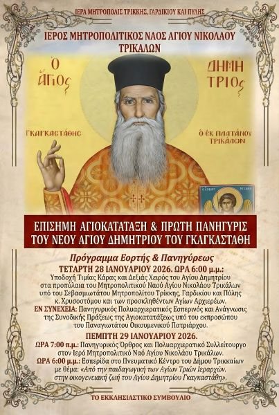 Η τελετή Αγιοκατάταξης, πρόκειται να λάβει χώρα την Τετάρτη,28/01/2026,στις 6 το απόγευμα, στα προπύλαια του Ιερού Μητροπολιτικού Ναού του Αγίου Νικολάου στα Τρίκαλα, όπου θα ξεκινήσει με την υποδοχή του Τιμίου Λειψάνου του Αγίου Δημητρίου, υπό του Σεβασμιωτάτου Ποιμενάρχου Τρίκκης, Γαρδιλίου και Πύλης, κ. Χρυσοστόμου, και των προσκληθέντων Αγίων Αρχιερέων, για να