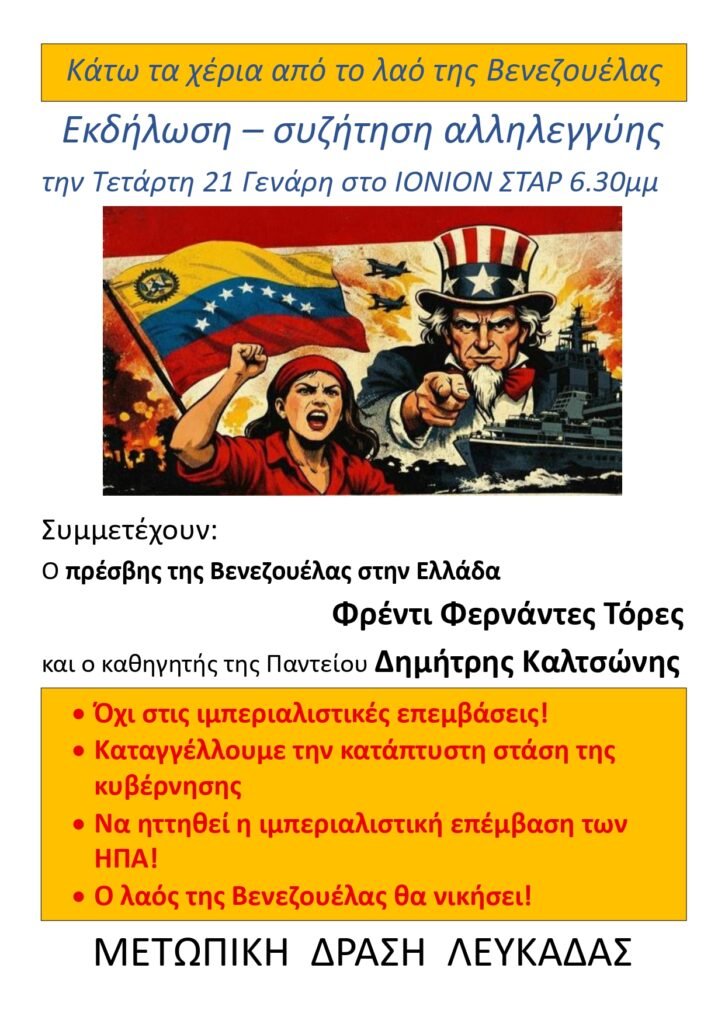 Εκδήλωση – συζήτηση αλληλεγγύης με σύνθημα «Κάτω τα χέρια από το λαό της Βενεζουέλας» διοργανώνει η Μετωπική Δράση Λευκάδας,
