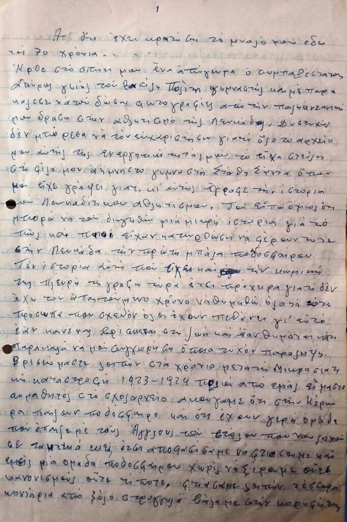 «Ήρθε στο σπίτι μου ένα απόγευμα ο συμπαθέστατος Σπύρος γυιός του Βασίλη Πολίτη γυμναστής και με παρακάλεσε να του δώσω φωτογραφίες από την παλιά νεανική μου δράση στον αθλητισμό της Λευκάδος. Δυστυχώς δεν μπόρεσα να τον ευχαριστήσω γιατί όλο το αρχείο μου αυτής της ενεργητικότητας μου το είχα στείλει στον φίλο μου αήμνηστο γυμναστή Στάθη Σάντα όταν μου είχε γράψει γιατί κι αυτός έγραφε την ιστορία του Λευκαδίτικου αθλητισμού. Του είπα όμως ότι μπορώ να του διηγηθώ μία μικρή ιστορία για το πώς και ποιοι είχαν κατορθώσει να φέρουν τότε στην Λευκάδα την πρώτη μπάλα του ποδοσφαίρου.