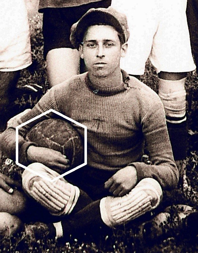 Κρατά την δερμάτινη μπάλα και με άψογο ύφος κοιτάζει τον φακό. Η φωτογράφιση όλης της ενδεκάδας έγινε στο Κάστρο της Αγίας Μαύρας το 1930ή 1931 κι η φωτογραφία είναι απόσπασμα αυτής. Προσέξτε εδώ που φαίνεται καθαρά το σήμα του τότε Τηλυκράτη ζωγραφισμένο στην μπλούζα του Βαλαμόντε. Η μπλούζα αυτή του τερματοφύλακα είναι κατά πάσα πιθανότητα η ίδια μ αυτή του Νίκου Κοντή στην φωτογραφία Νο 6. Επίσης είναι εμφανείς και οι επιγονατίδες που προστάτευαν την άρθρωση του γόνατος».