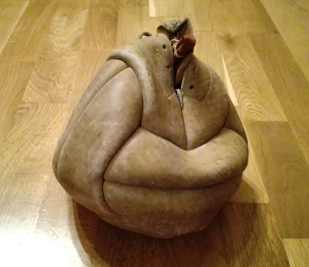 «H μπάλα της φωτογραφίας αποτέλεσε έκθεμα στην έκθεση του 1998. Χρονολογείται περί τα 1950-55. Αποτελείται από 12 συρραμμένες λωρίδες δέρματος , και μία σαμπρέλα με λαιμό, όπως περίπου των μπαλονιών, Αφού την φούσκωναν δίπλωναν τον λαιμό αυτό, τον έδεναν με σπάγκο και σκέπαζαν με μια άλλη λωρίδα δέρματος ώστε να μην προεξέχει. Όλα μαζί τα έδεναν μετά με το ειδικό κορδόνι κι έκλεινε έτσι το κενό από το οποίοι η σαμπρέλα πέρναγε στο εσωτερικό της μπάλας. Φυσικά το να βαρέσεις κεφαλιά και να σε πετύχει αυτό το σημείο ήταν αρκετά επώδυνο . Φαντασθείτε, όπως μου έλεγαν παλαίμαχοι ποδοσφαιριστές, τον πόνο στο κεφάλι όταν η μπάλα λόγω βροχής μπορεί να ζύγιζε αρκετά κιλά, αφού δεν ήταν αδιάβροχη! Αν συγκρίνει κάποιος αυτή την μπάλα, με τις μπάλες των εικόνων 6,7 και 10, φαίνεται καθαρά ότι πρόκειται για κατασκευή , ίδιας τεχνολογίας!».