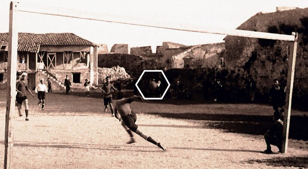 «Ο Κώστας Βαλαμόντε σε έξοδο, προσπαθεί να πιάσει την δερμάτινη μπάλα. Αγώνας στο Κάστρο της Αγίας Μαύρας περί το 1931-32.